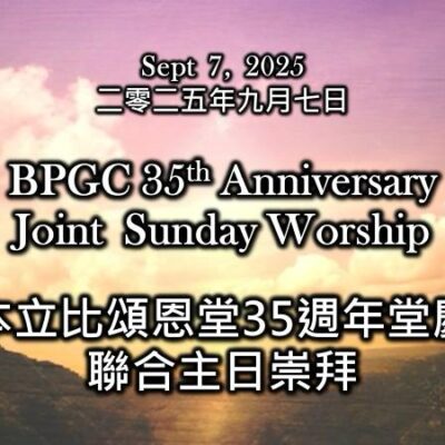 BPGC 35th Anniversary Joint Sunday Worship September 7, 2025 Nathaniel In-person Services, Online Services 0 Comments Direct: https://youtu.be/IkJLjf1k–c Scripture: Mark 14:3-9 Announcements Links:Here are some links related to this week’s announcements:• Worship Service Team Sign-up• Online Giving Page Newcomer’s Welcome Form: