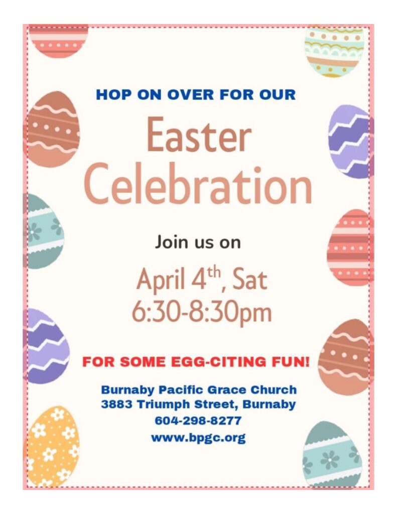 Kids Club Easter Celebration will be held on Saturday April 4, 6:30pm-8:30pm at church. All are welcome! Any inquiries, please contact Pastor Ruth.
