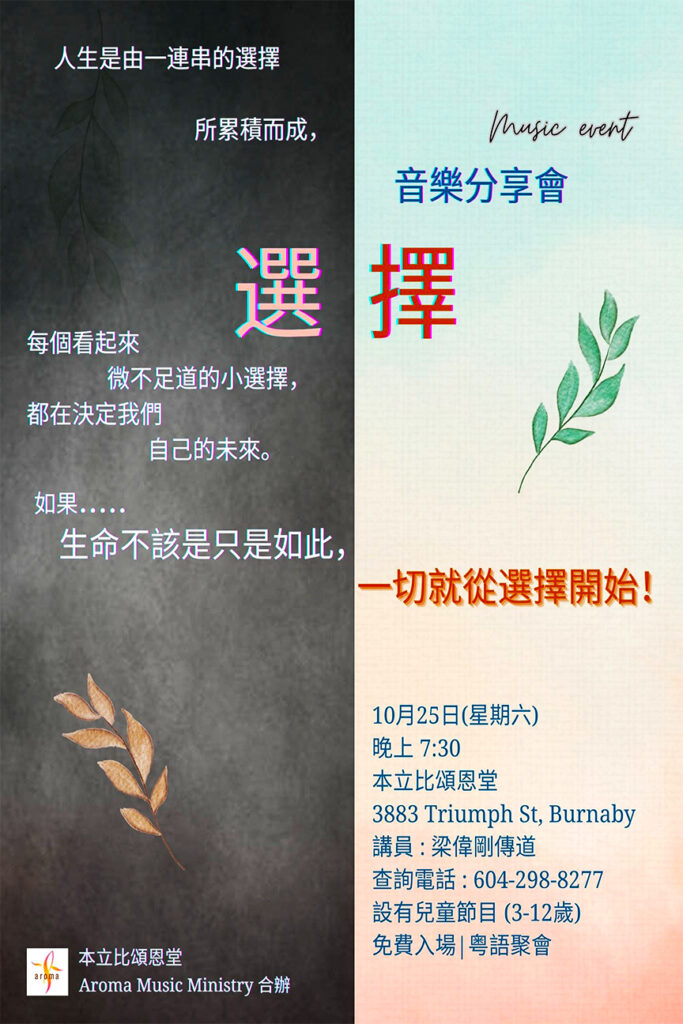 音樂分享會 October 22, 2025 admin 家事報告 邀請Aroma團隊透過精彩的歌唱音樂, 演譯出人生是由一連串的選擇所累積而成。每個看起來微不足道的小選擇, 都在決定我們自己的未來。如果…..生命不該是只是如此, 一切就從選擇開始! 定於10月25日(週六) 晚上7:30-9:30在教會禮堂舉行, 並設有3-12歲兒童節目。歡迎弟兄姊妹邀請親友一齊參加, 查詢詳情請與Stella Kann 或Alan Choi 聯絡。