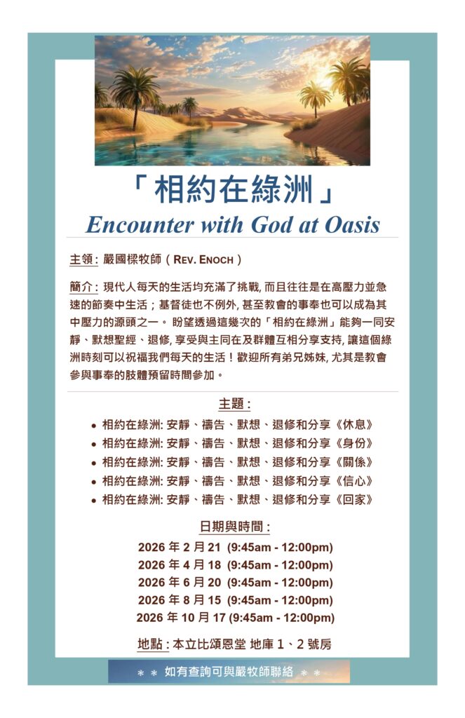 「相約在綠洲 」 (Encounter with God at Oasis) February 21, 2026 9:45am-12:00pm 由嚴國樑牧師主領。 主題: 相約在綠洲: 安靜、禱告、默想、退修和分享《休息》日期與時間: 2026年2月21日 (9:45am-12:00pm)地點: 本立比頌恩堂 地庫 1 、2 號房如有查詢可與嚴牧師聯絡。
